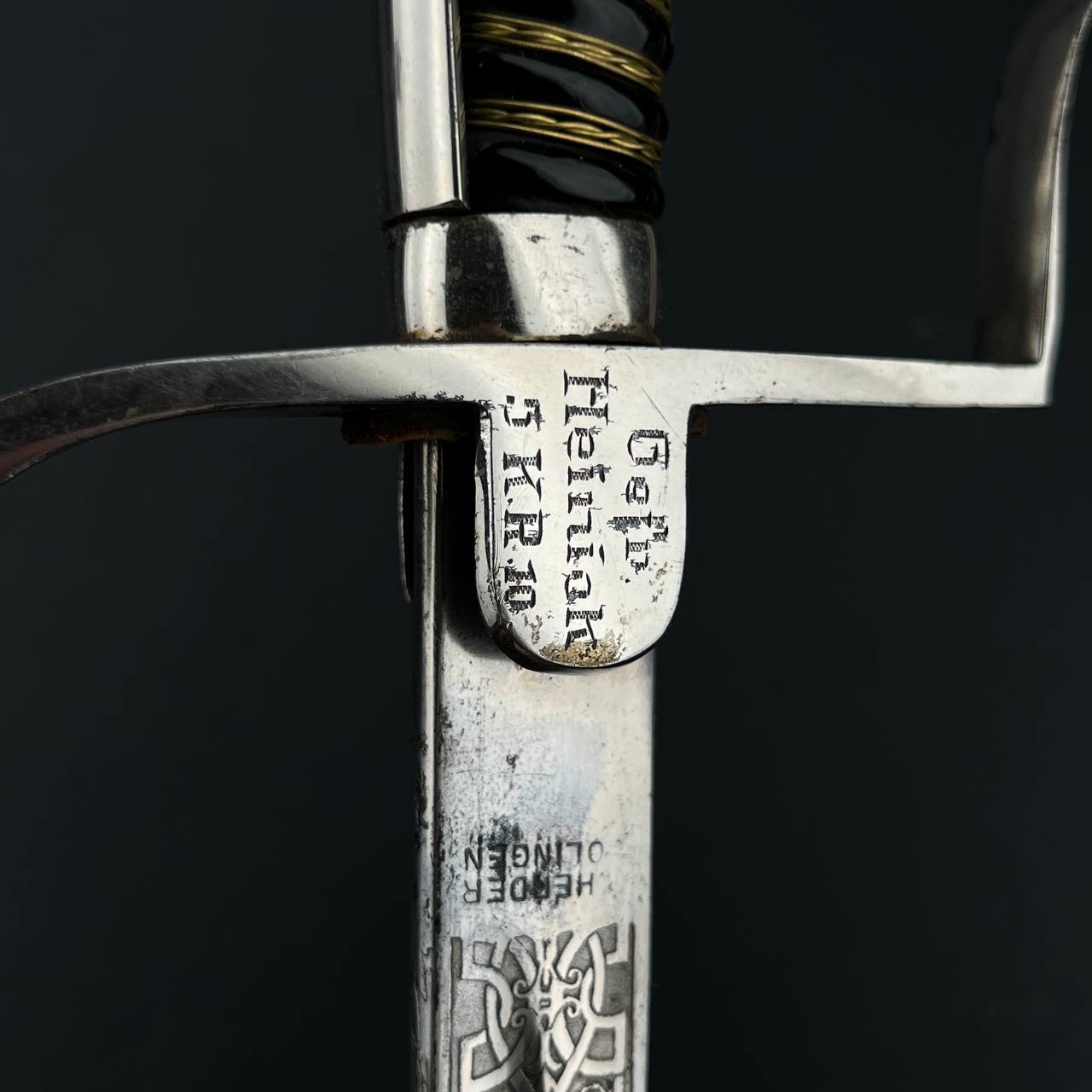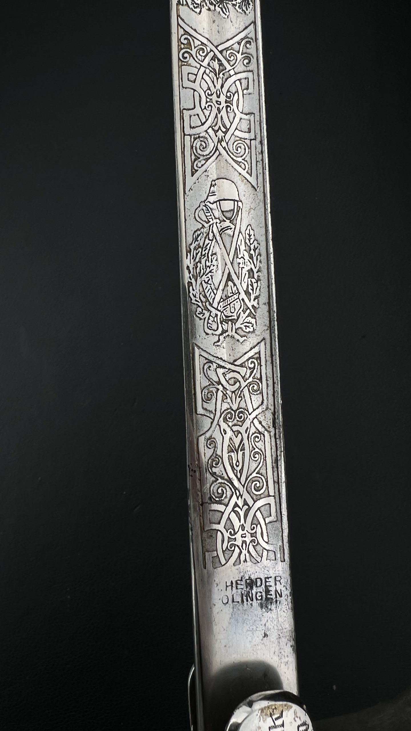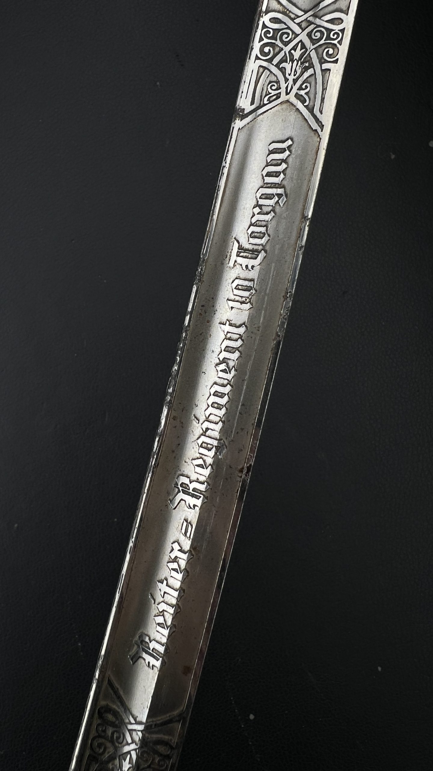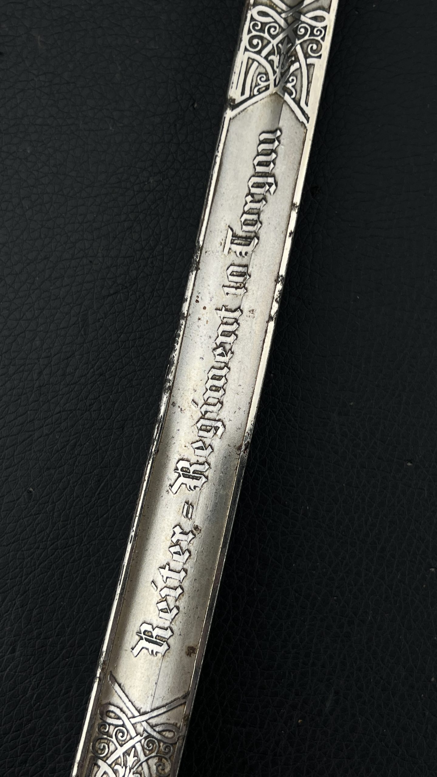 Клинок украшен  богатым травлением, включая кавалерийские мотивы, а также персональную надпись с указанием звания Gefreiter (ефрейтор), подразделения и 10-го кавалерийского полка, дислоцировавшегося в Торгау.